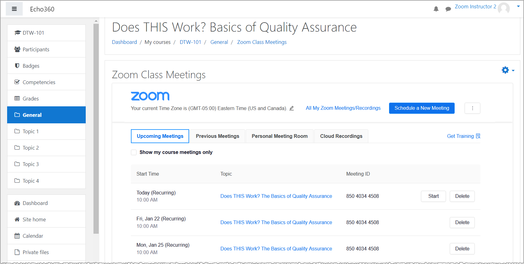 The Zoom panel lists your newly created meeting(s), as shown below. You can repeat these steps to add other class meetings for this course as appropriate.