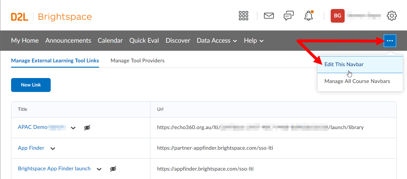 The procedures on this page can be performed by a D2L/Brightspace administrator for the Main navigation bar, or by an administrator or instructor for the Course navigation bar.