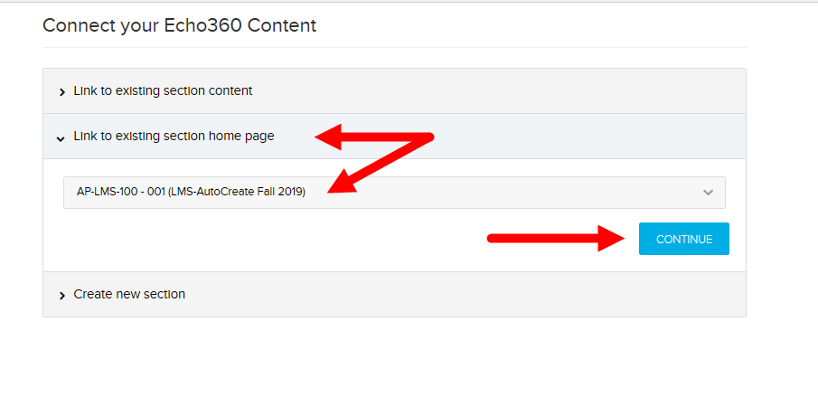 - In the Echo360 options screen that appears, scroll down (if necessary) to find and select the Link to existing section home page option.