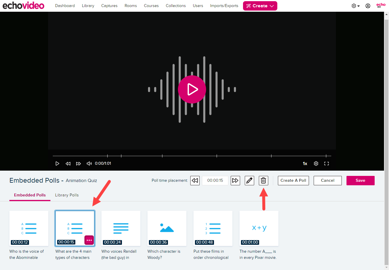 BE CAREFUL! Deleting a poll does not provide a warning. If you have not saved this edited media yet, you cannot undo the deletion. However, the poll you added still resides in your library and can be re-added and re-edited (if necessary).