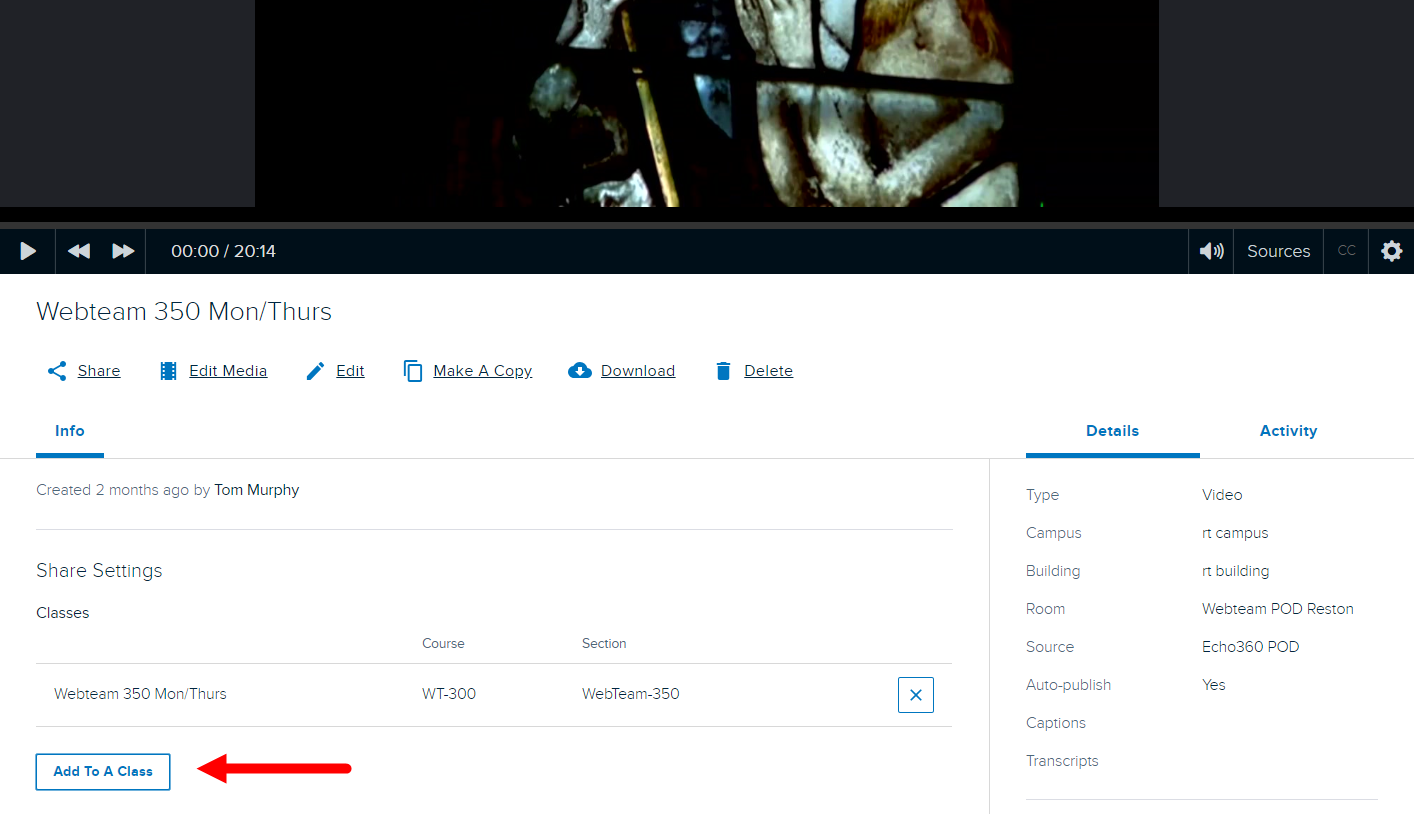 - Click the Add To A Class button in the Media Details Page, below the list of locations where this item may already be published.