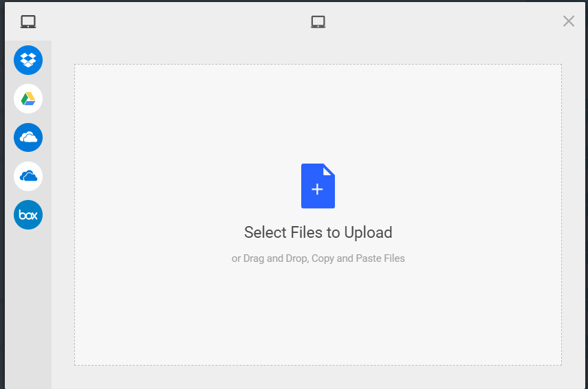 - Select Upload a file, then select an existing video file from your local computer or cloud storage location in the Filepicker dialog box. File location options are listed on the left. The file is uploaded and processed and will be made available for viewing once media processing is complete.