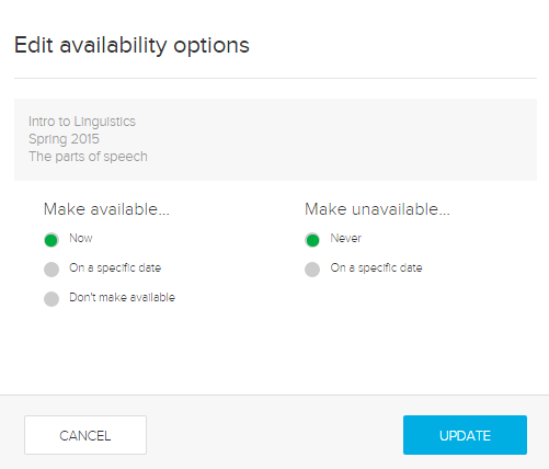 Once your content, including both presentations and videos, is associated with a class (published), you can make it available or unavailable at a schedule of your choice. This is referred to as date-based availability because you set the dates on which the item becomes available or unavailable for student viewing.