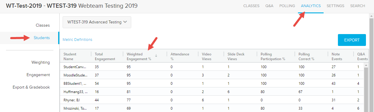 In addition, when you export Engagement to your LMS Gradebook, the value exported for the selected classes will be limited to video view percentage by each student. The same would be true for an Engagement export to CSV as well for the Weighted Engagement score shown in an Export of Student Data to CSV.