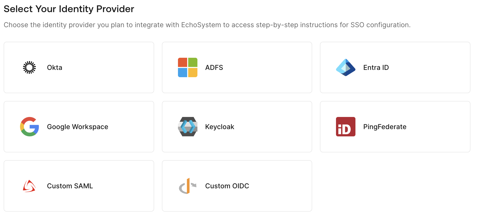 - Choose the identity provider you plan to integrate with EchoVideo to access step-by-step instructions for SSO configuration.