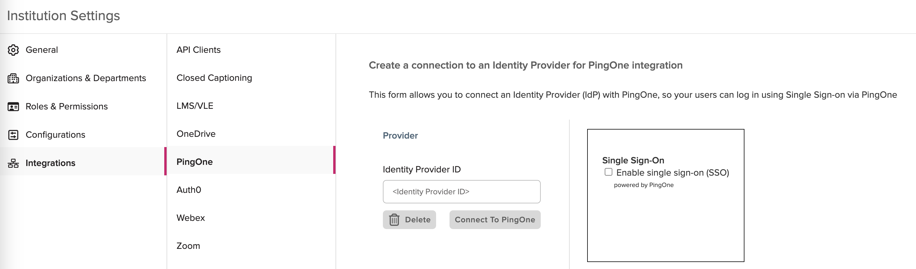 Beginning the Auth0 configuration will immediately disable an existing PingOne SSO integration preventing new SSO logins until the setup is complete. Do not proceed until you have all the necessary information and expertise at your disposal. Please save your existing PingOne Identity Provider ID and have your EchoVideo institution ID copied before proceeding.