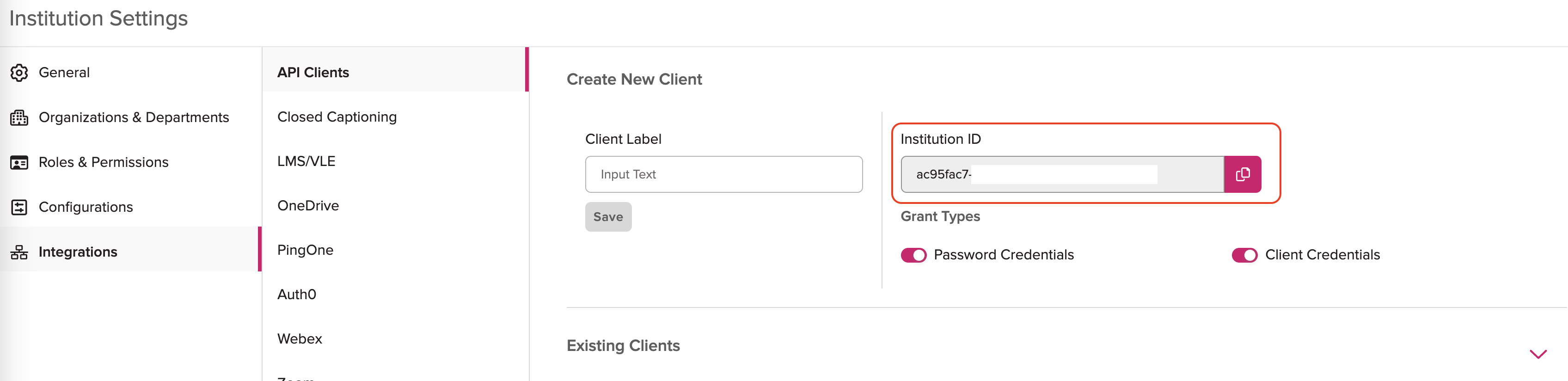 Your EchoVideo Institution ID found on the Institution Settings -> Integrations -> API Client page.
