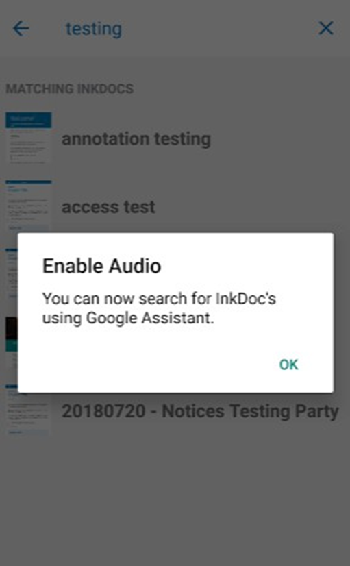 When you tap Search in the app, you will be given the option to enable audio with the Google Assistant. Enabling this feature lets you search for a phrase in Inkdoc titles or text without opening the app.