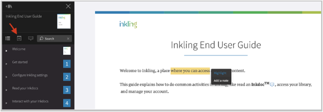 Click the text to activate a context menu and add a note or highlight. Your notes and highlights for an Inkdoc display in its Notebook.
