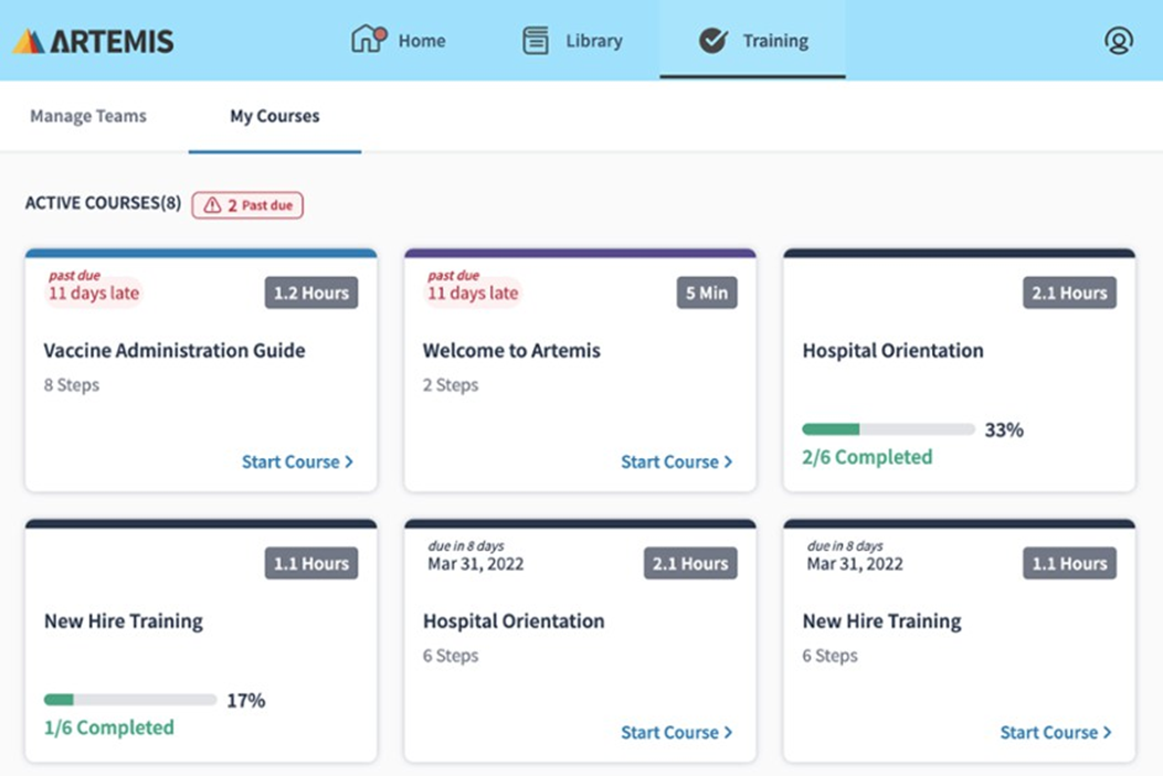 Once on the Training screen, you will see your courses divided into sections: