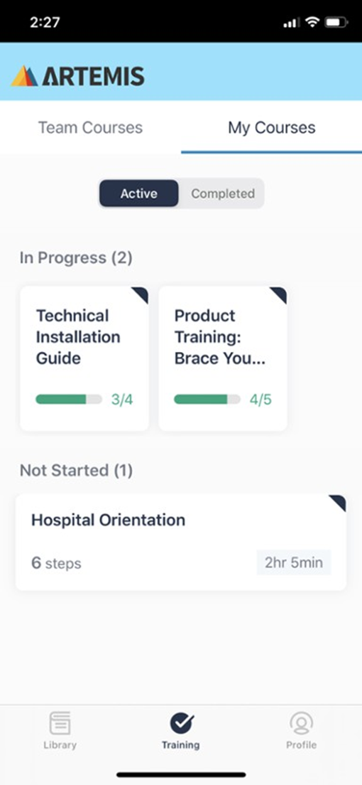 In the Active tab, you will see courses that have been started displayed at the top of the screen, along with detailed step progress bars under each course title. You can scroll through the In Progress courses by swiping to the left.