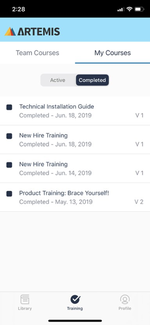 In the Completed tab, you can access all the courses you have been previously assigned and completed. Access old course material by tapping on a specific course title.