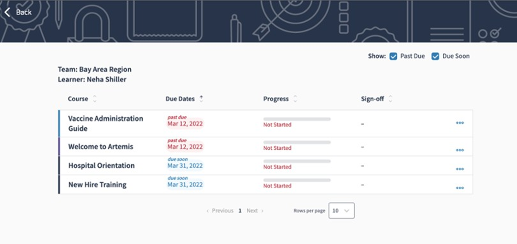 By clicking on the due dates in the status column for any team member, you can view the course progress for that Learner along with the due dates. As with the team view, you can display only courses that are Due Soon or Past Due.