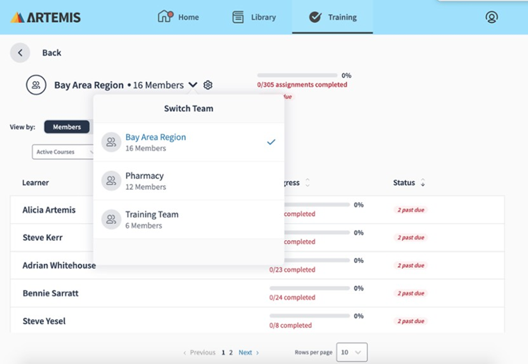 You can click on the dropdown to see the different teams you belong to with a Manager or Supervisor role. If you have the Member role on a team, you will not see the Team Courses tab for that team.