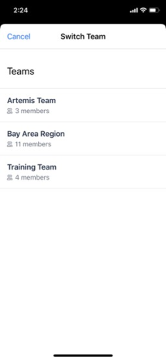 As a Manager or Supervisor of multiple teams, you can tap the selected team to see the other teams you belong to with the Manager or Supervisor role. You can also see the members of the selected team by tapping either Manage Team or View Team. If you have the Member role on a team, you will not see the Team Courses tab for that team.