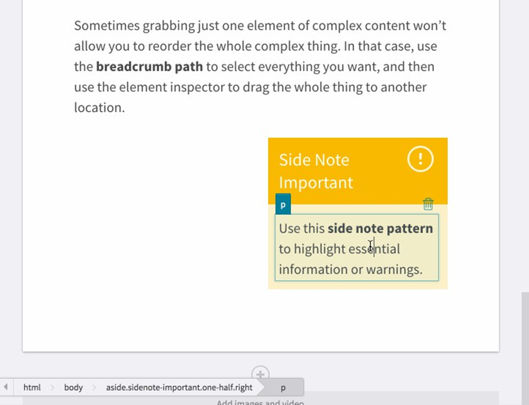 HTML elements can be nested inside one another. If you want to select a complex element that is made up of sub-elements, use the breadcrumb bar to select the element you want, and then use the element inspector to drag the whole thing to another location. The breadcrumb bar can be revealed or hidden by clicking on the arrow tab at the bottom left of the preview pane.