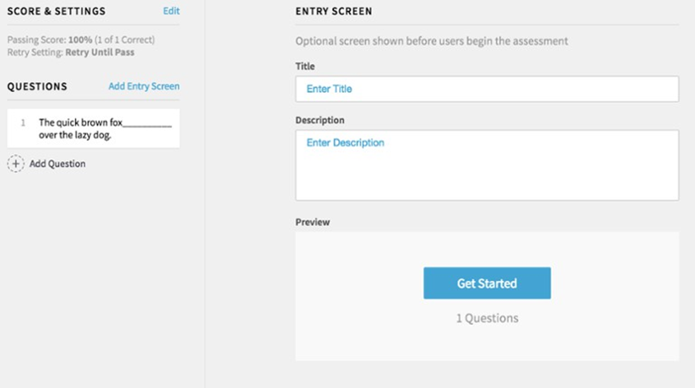 Optionally, click Add Entry Screen on the left side to create an optional screen that users view before taking the assessment. This screen provides general information and also includes a Get Started button for users to begin the assessment.