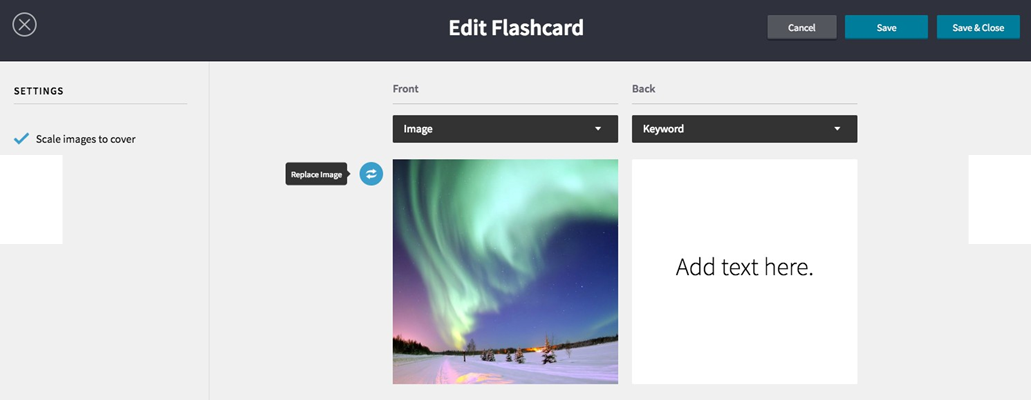 - Optionally, check Scale images to cover in the SETTINGS sidebar to resize images to cover the entire flashcard.