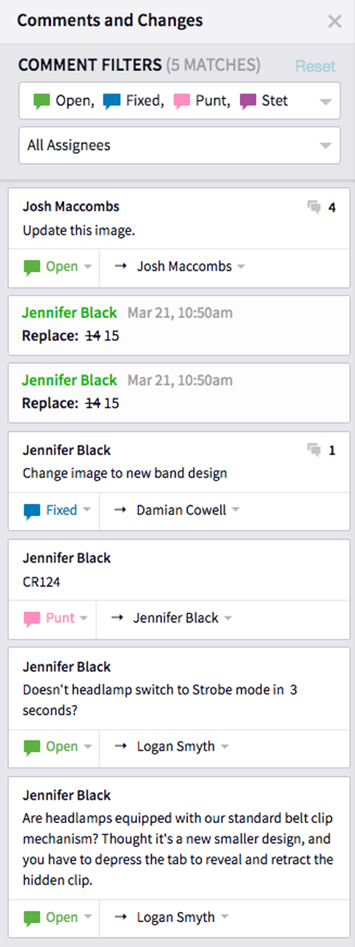 The image shows the difference between change messages and comments. In the example, the change messages are marked with the team member's name, Jennifer Black, in green.
