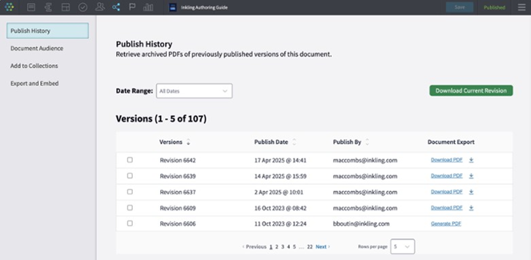 You can view and export previously published versions in Export and Distribute > Publish History.