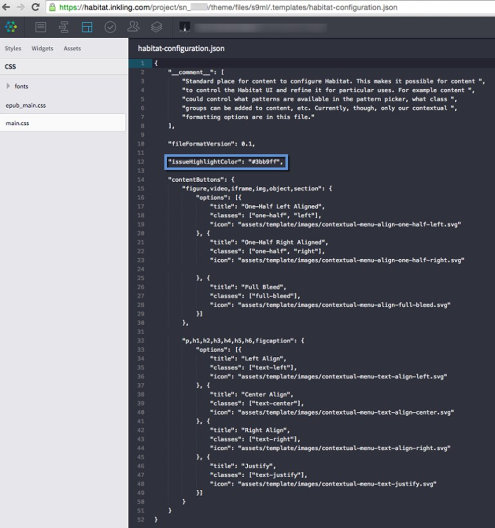 "issueHighlightColor"key-value pair to thehabitat-configuration.jsonfile. Add this key-value pair below the"fileFormatVersion"key-value pair. Use a six-digit hex code for the color value.Be careful when editing this file. Do not change any other code or formatting, and be sure to format the