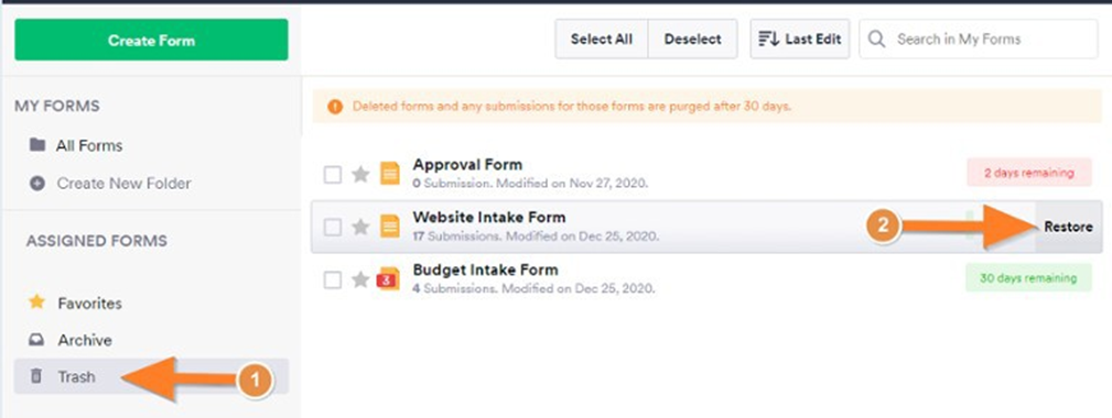 If you have a form and it has been accidentally deleted from your My Forms page, you can restore the form by following the steps below: