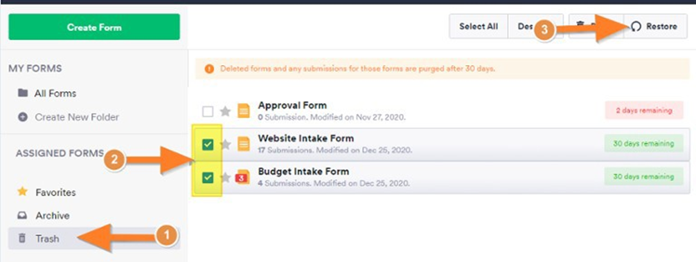 If you have multiple deleted forms you want restored, select them from the list and click the Restore option in the top buttons.