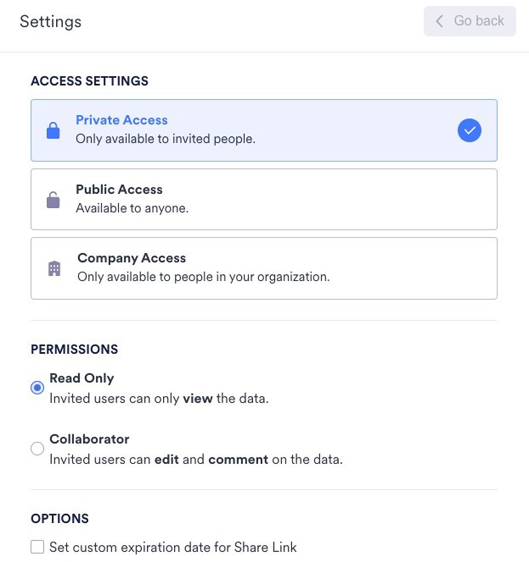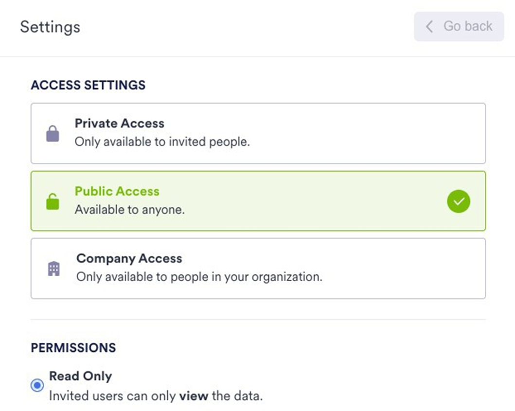 When you choose Public Access, Read Only is the only permission available that allows the collaborators to view and download the data. You cannot set an expiration date for Public Access.