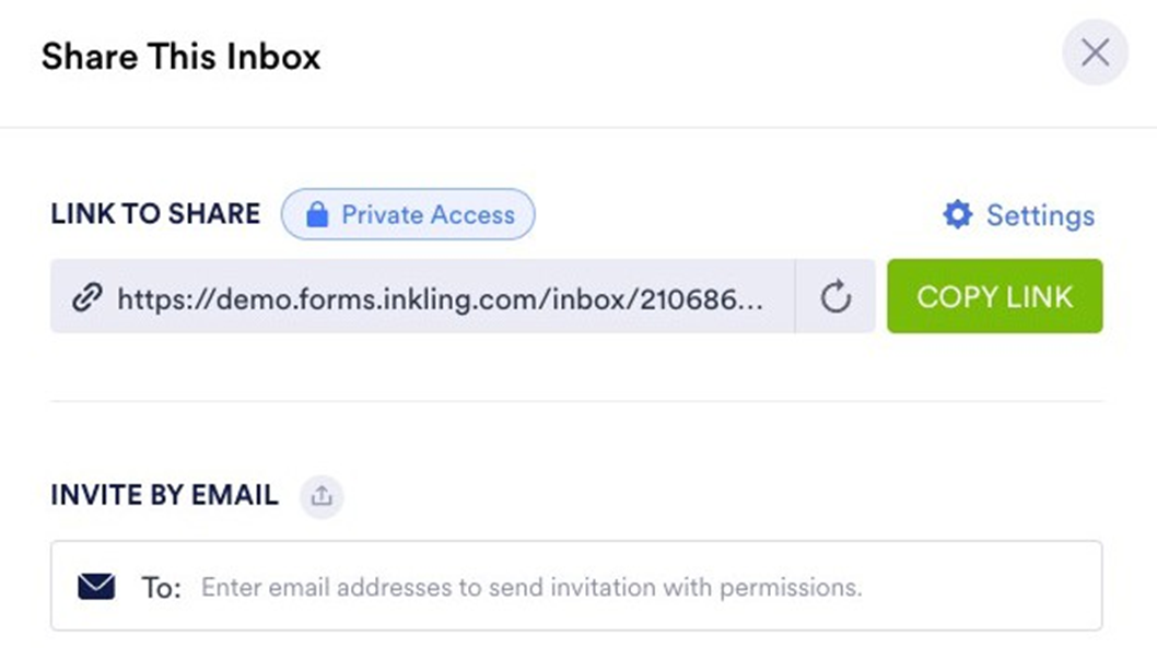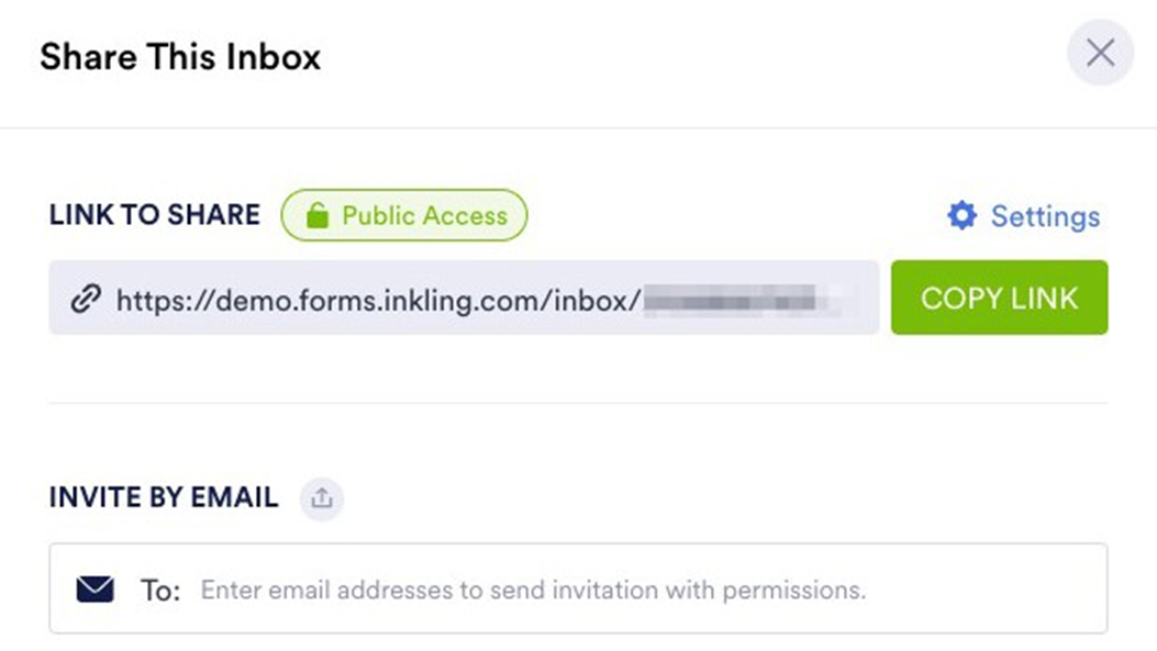 You must have an Inkforms account to access a Private Inbox. A Public Inbox can be viewed with or without an account. Company Access requires an Inkforms account registered to an email address with the same domain as the one listed in the Share Settings.