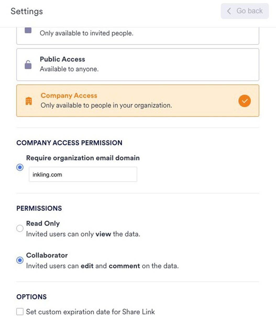 Both Read Only and Collaborator permissions are available for Company Access. You can also set a custom expiration date for the link.