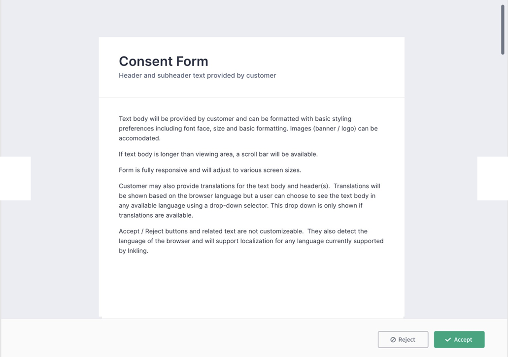 If you change the consent language or desire to trigger re-acceptance for all end users, a new form version will be created, which will have a new form ID. Since the end user has not accepted that formID, the interstitial page will be displayed again and require a response. This request should be made via Inkling support, and support will need new text and translations. Please plan on providing new text, new images, and new translations two weeks prior to the desired rollout date for the revised consent form.