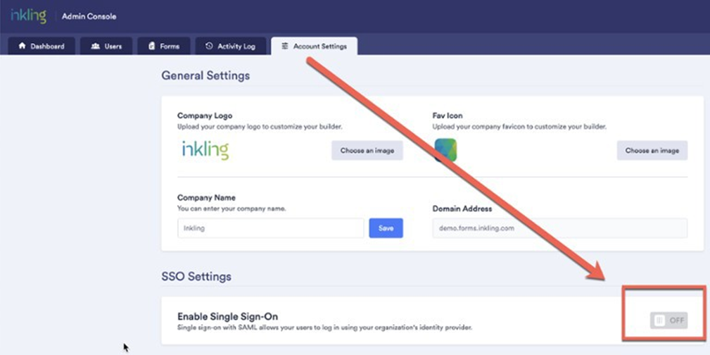 Click the Account Settings tab, then toggle Enable Single Sign-On to ON.