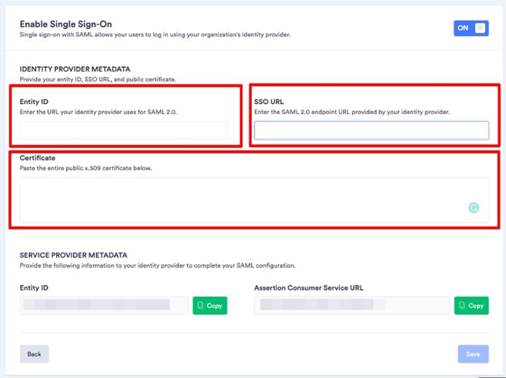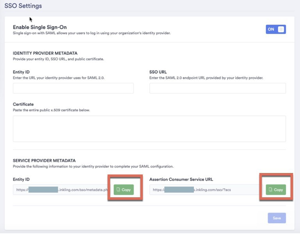 Copy SERVICE PROVIDER METADATA links to use for SAML configuration at the identity provider side.
