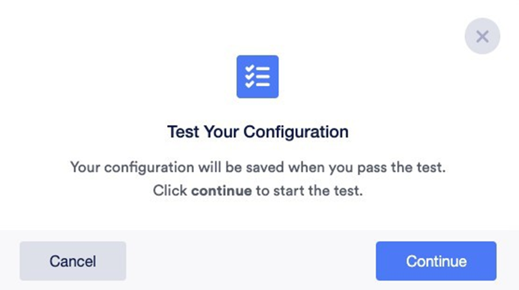 - Click the Save button, then test the configuration by clicking the Continue button.