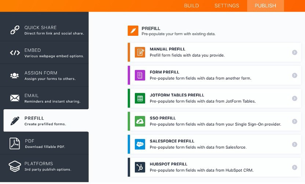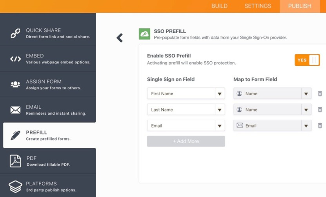Once you have built your form, navigate to the Publish tab and select Prefill in the left navigation. Then select SSO Prefill.