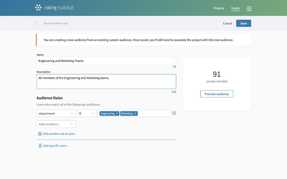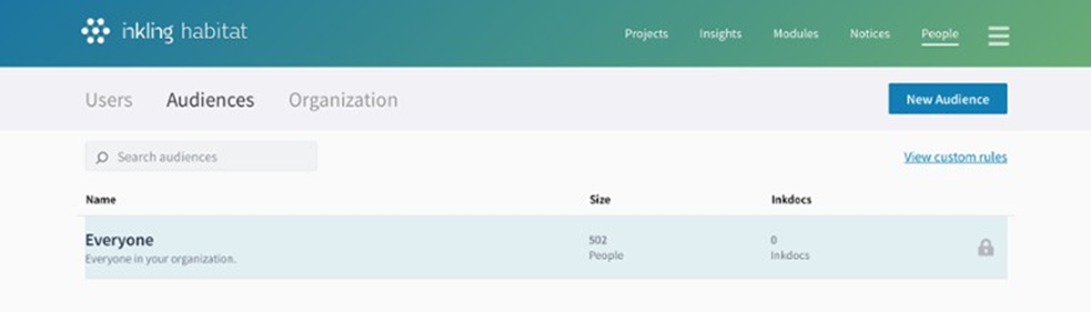 Custom rules may be created by Habitat Project Admins on an ad hoc basis for individual Habitat projects using the in-project rule builder. All custom rules in your organization may be viewed or deleted on the Audiences dashboard. Custom rules may also be converted to an Audience with this functionality.