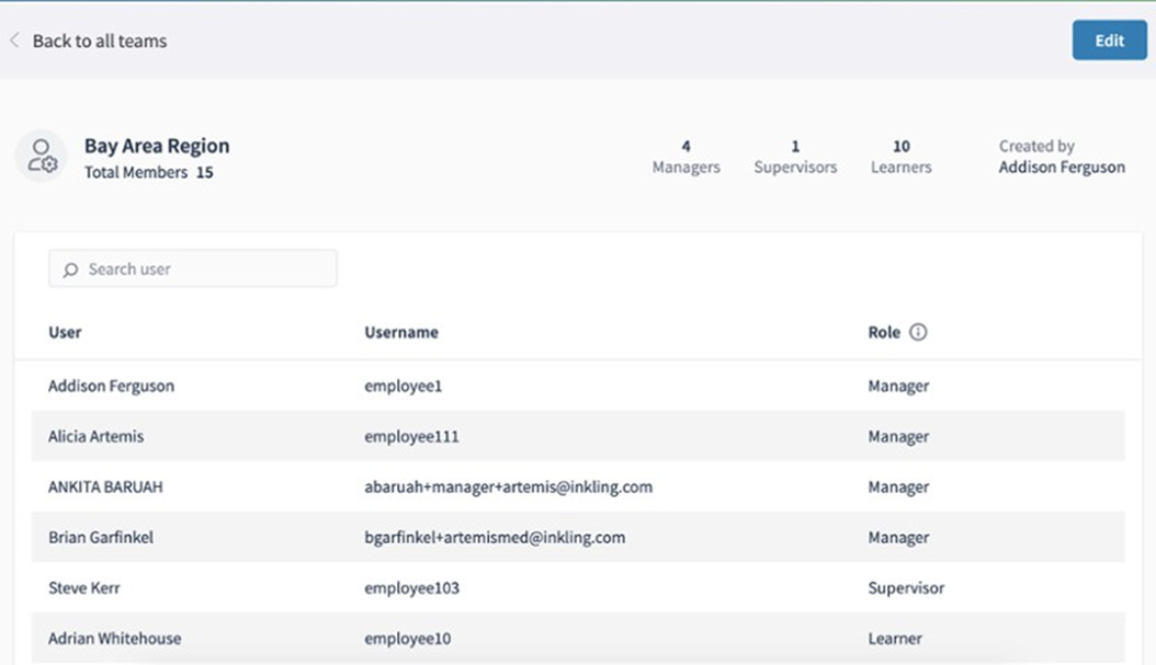 Clicking a page takes you to a team page where you can see all members. Click on Edit to make modifications to the team.